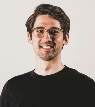 A kitchen with teal cabinets and wooden countertops. The backsplash features artistic sepia-toned images. The room has a modern stove and a stainless steel sink under a window. Exposed wooden beams are visible on the ceiling, with recessed lighting.